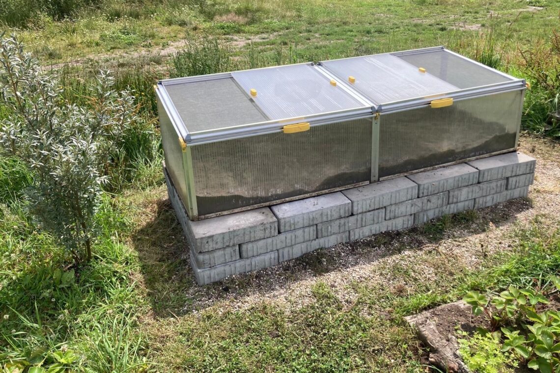 Wir haben das Frühbeet aufgebaut und mit den restlichen Steinen auf eine angenehme Arbeitshöhe gesetzt.